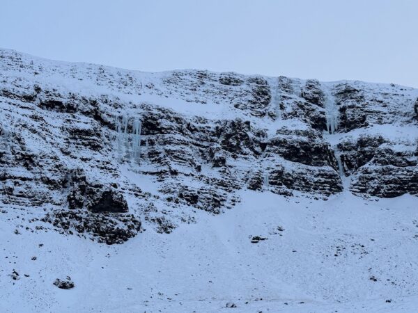 Leiðin byrjar í 10m hárri súlu vinstra megin við Bæjarfoss. Klifrað er upp með súlunni undir hvelfinguna sem fossinn fellur fram af, síðan er hliðrað milli ískerta sem renna undan þakinu. Leiðin endar innst í hvelfingunni hægra megin við Bæjarfoss. Leið nr. 3 á mynd, 50m.