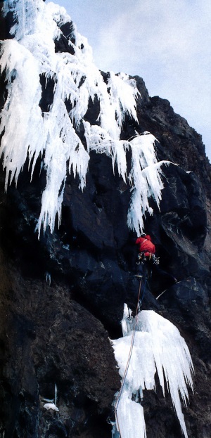 Leiðin vinstra megin, Dvergaklof, er Wl 5, full spönn og byrjar á kerti sem nær tæplega niður, en það er hægt að klifra ísbunka upp að því og klofa út í kertið þaðan.