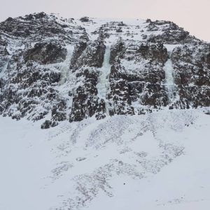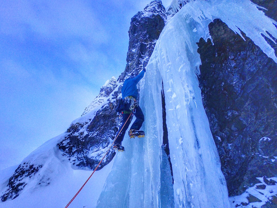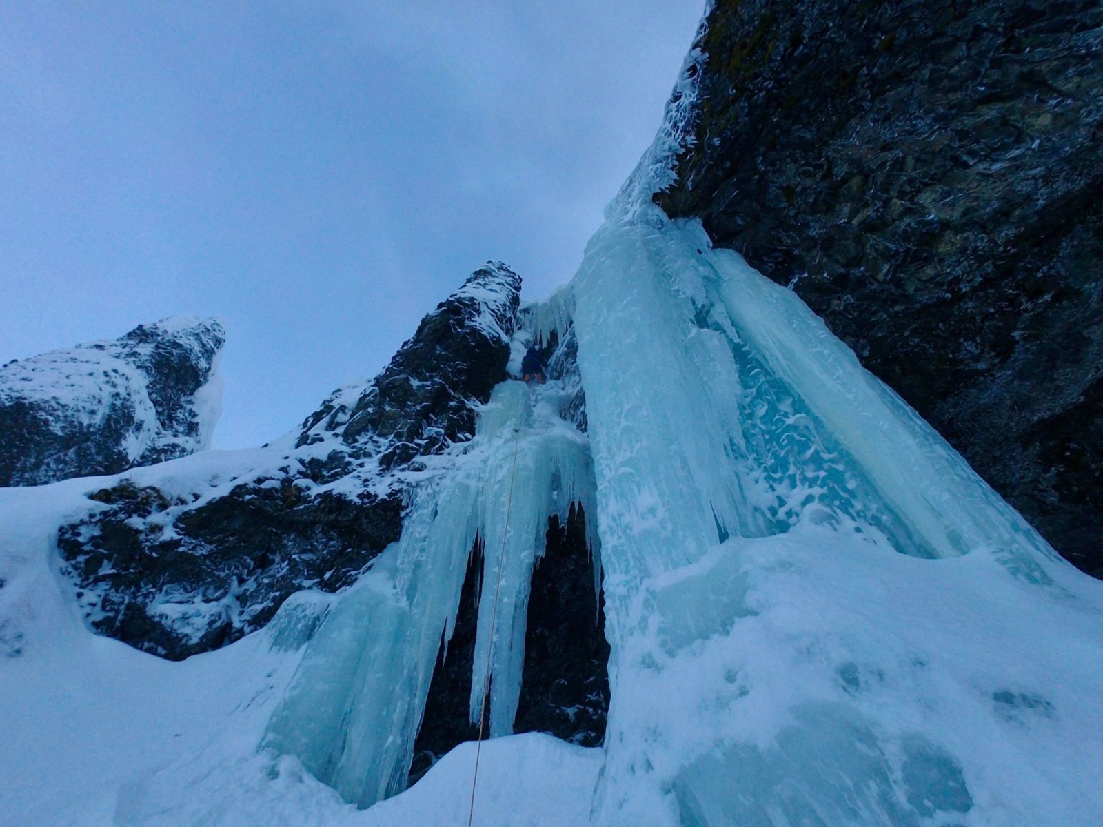 First 30m are around 70° snow/ice. Then the crux of the route is a 10m section of 80° – 85° ice, around WI4 difficulty. Then the last meters are easier, around WI3 55m total.