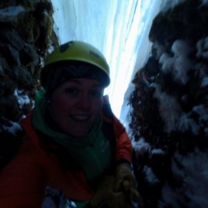 Nokkuð greinilegt kerti sem sést vel neðan af veg. Góðar tryggingar neðst en þegar ofar var komið varð ísinn frekar þunnur og helst tryggjanlegur með spectrum. Upp á brún var ísinn það þunnur að gáfulegast þótti að síga niður úr leiðinni.