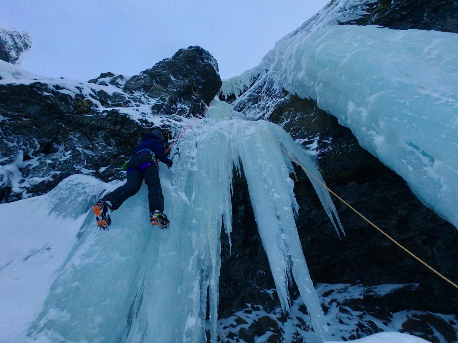 Leiðin byrjar í WI 2 ísbrölti og síðan eru þrjú 7-14 metra höft. Efsta haftið er erfitt að tryggja þar sem stórt holrúm er á bakvið þunnan ísinn og nýttust stuttar ísskrúfur og spektrur einna best. Lítið um ís uppi á brúninni, aðeins mosi og þunn ísskæna á steinum
