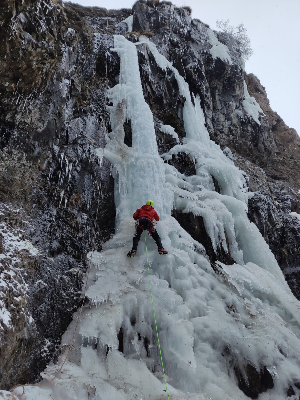 Mostly on thin ice that didn’t take screws, at least not in the condition it was in during the first ascent.