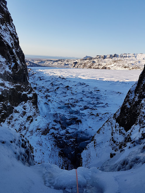 Til að komast út af jöklinum gæti þurft að síga fram af (áin myndar helli, farið varlega) eða maður gæti orðið heppinn og bara stigið beint útaf.