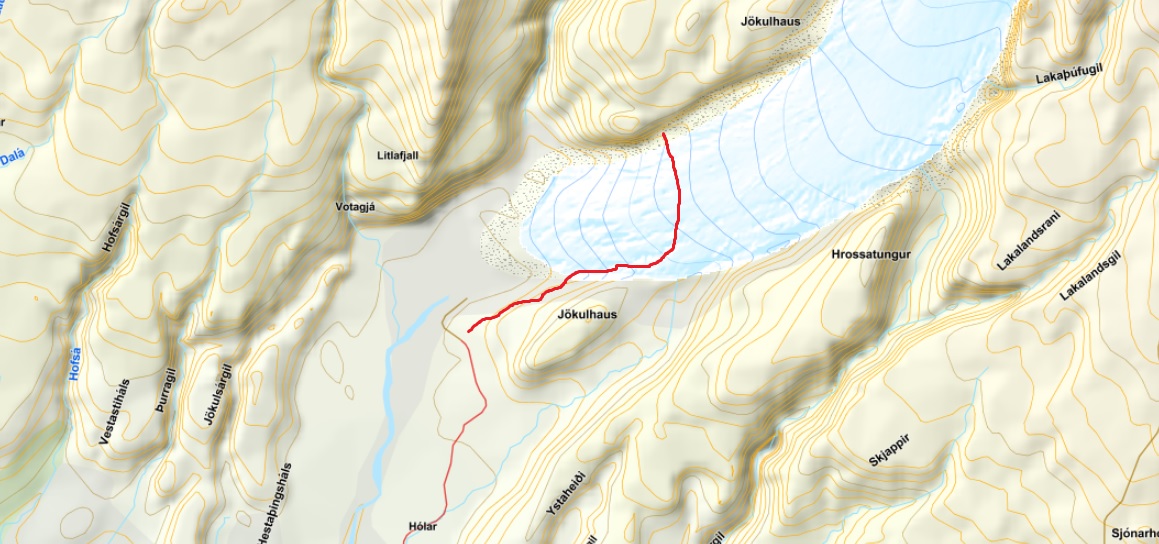 Fólk sem hefur áður gengið þarna upp að talaði um að þarna væri lítið uppistöðulón og héldum við að þar sem að lónið fyrir framan jökulinn væri frosið, þá hlyti þetta lón að vera frosið líka og við gætum gengið beint að leiðinni þegar við stigum út af jöklinum. Lónið var hins vegar búið að tæma sig og skildi eftir áhugaverð ummerki, lína í snjónum á jöklinum og ís sem að hafði áður lagt yfir lónið lá þarna á víð og dreif undir.