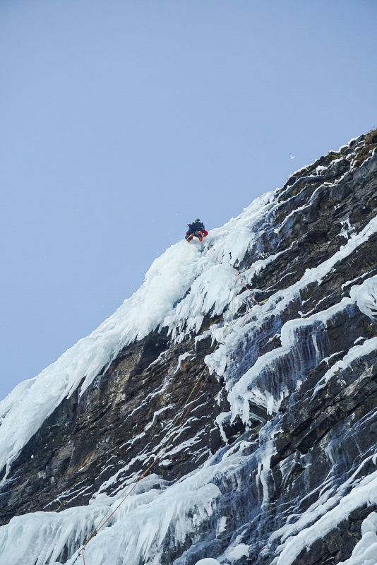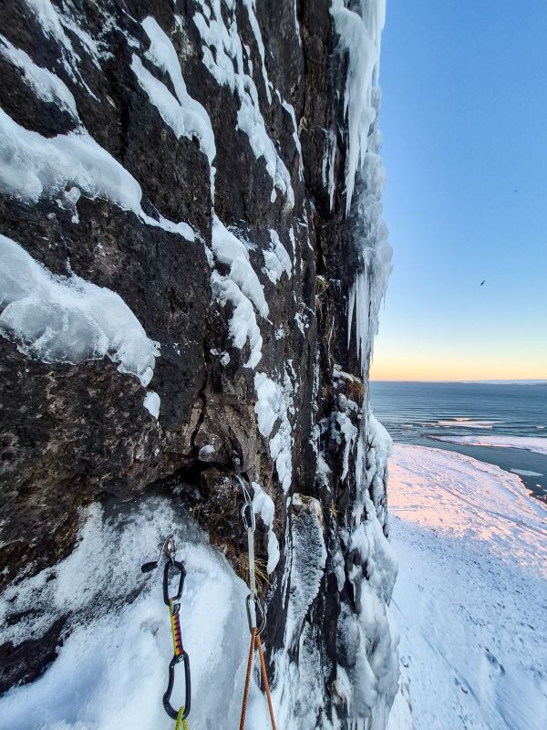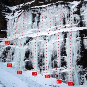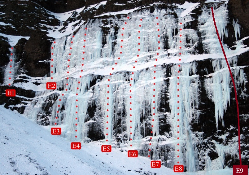 Línan lengst til hægri í hamrinum þar sem einhver ís að ráði myndast. Ísinn virðist þó ná sárasjaldan og illa að tengjast saman, svo leiðin krefst yfirleitt einhvers blandaðs klifurs. Í frumferð var farið upp með hægri hluta íssins og í þurra hlutanum var klifrað eftir stórum flögum. Flögurnar eru ansi mikilvægar fyrir klifrið og tryggingar (fyrst og fremst hunda/spectrur), en nokkuð lausar og brothættar. Hins vegar virðast þær tolla vel í frosti, svo þessi leið hentar líklega ekki sérlega vel til mixklifurs í hláku. Eftir tæplega 10 m blandað klifur taka við nokkrar brattar hreyfingar upp í neðstu kerti efri hlutans, hvaðan tekur við lóðréttur ís upp á syllu. Fyrri spönn er rúmir 50 m, seinni spönn er jafn löng en öllu auðveldari, yfirleitt um WI3-4 og skipt upp af stuttri snjóbrekku.