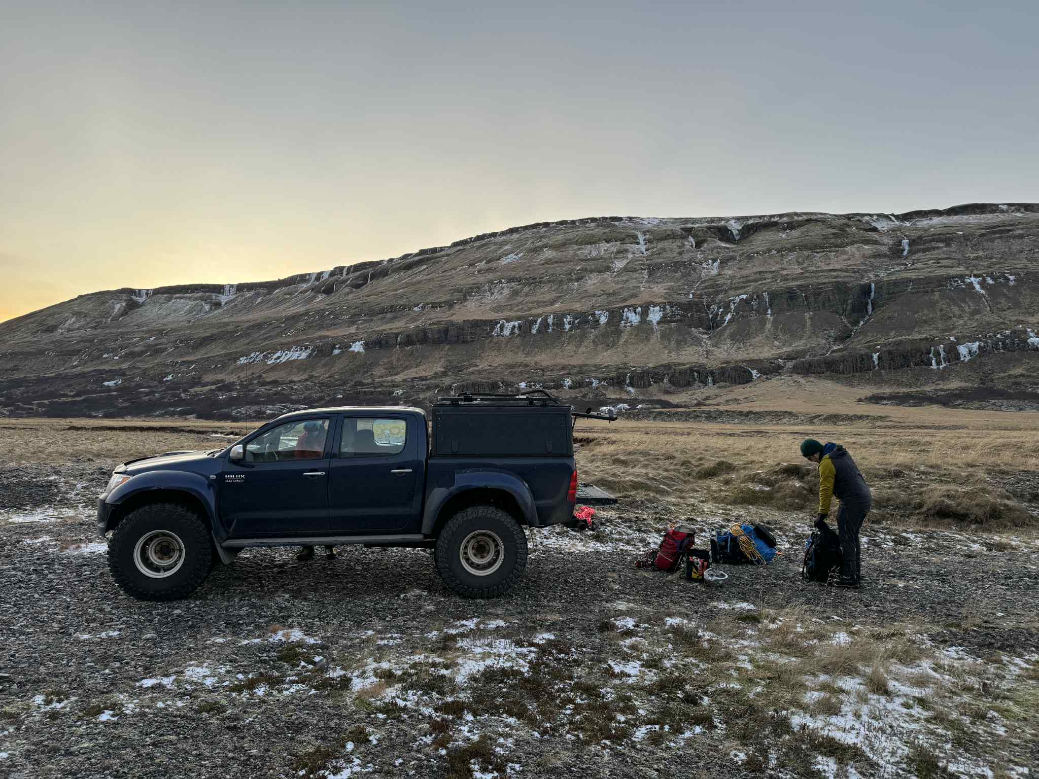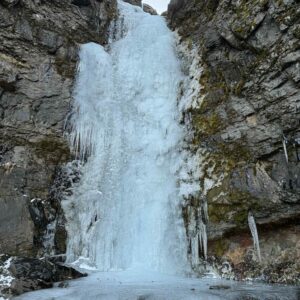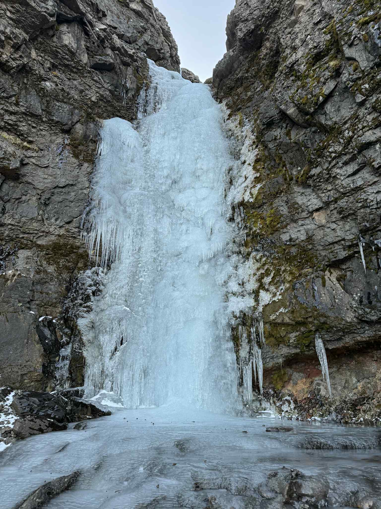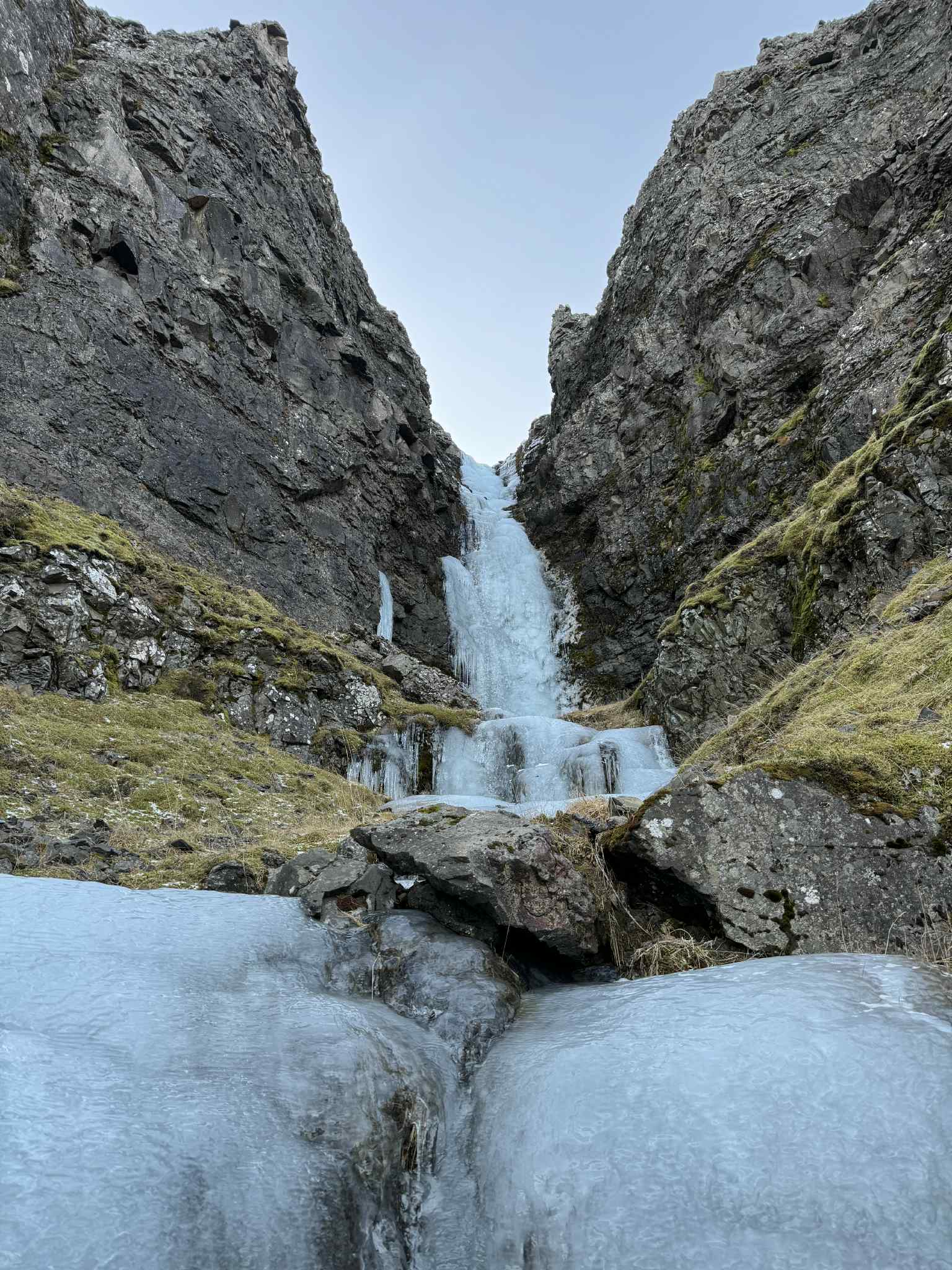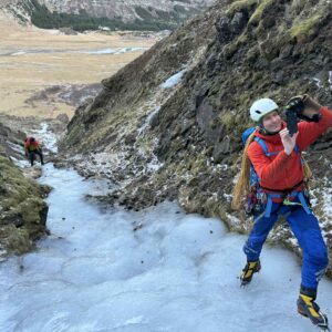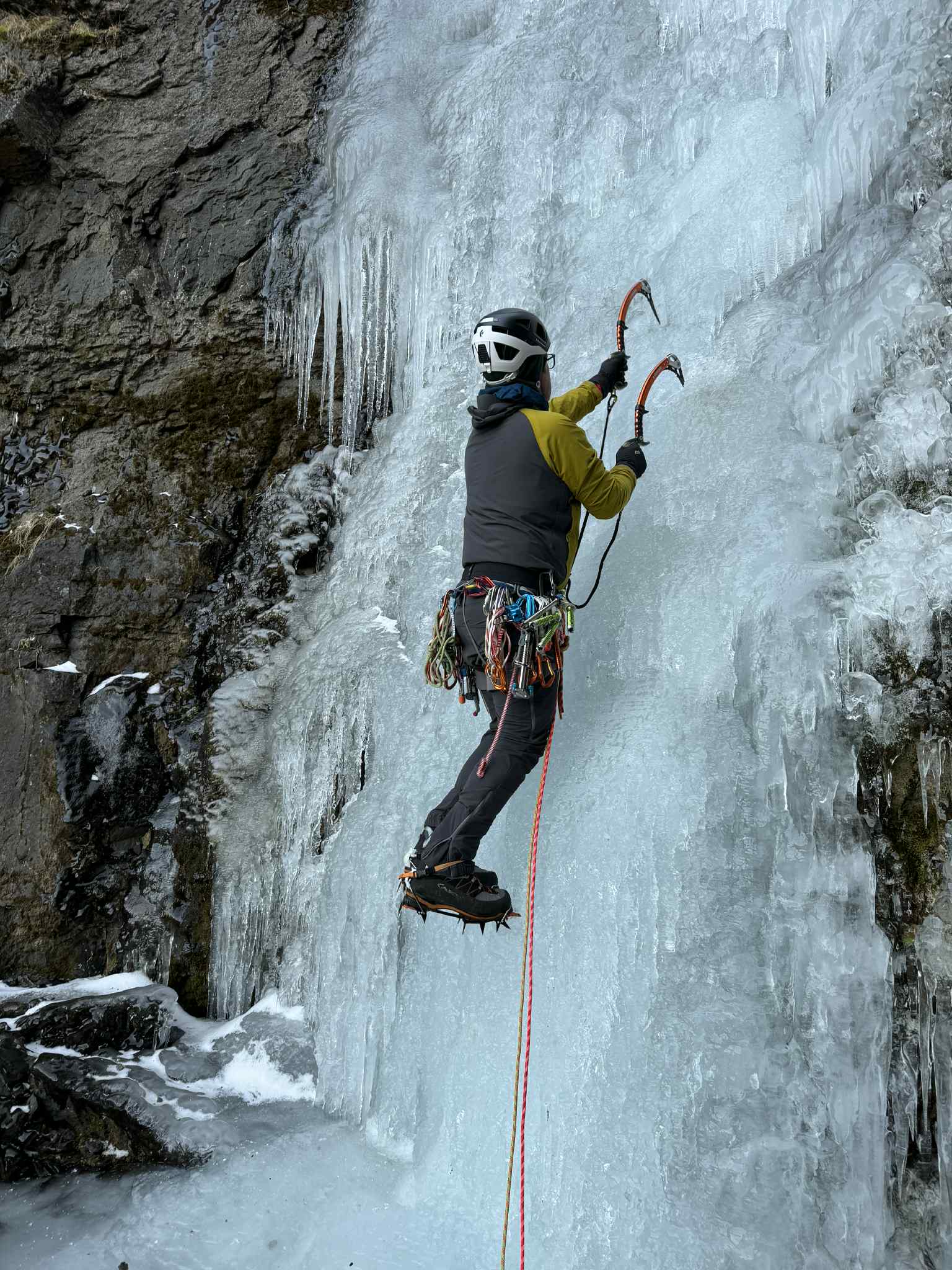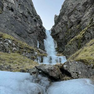 WI3 klifri lýkur eftir ~30m, hægt að halda áfram upp nokkur stutt þrep en ekki alveg þess virði