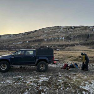 Mjög auðveld niðurganga fyrir vestan „Fjarska glaður“, aðeins brattara að ganga til austurs og brölta niður, allt í lagi ef það eru góðar snjóaðstæður.